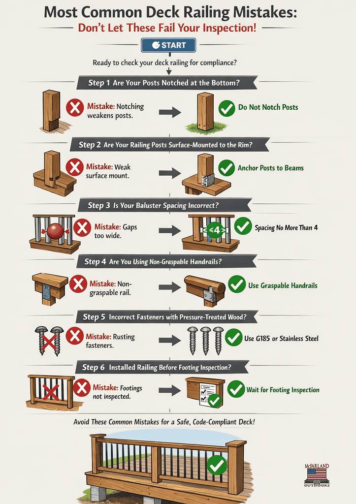 - Why It Fails: Installing the railing before the footings are inspected means the inspector cannot verify the posts and blocking, leading to a requirement for tear-back.